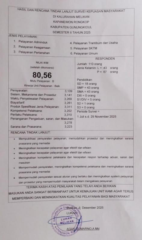 Melikan_(Sida Samekta). Pemerintah Kalurahan Melikan Kapanewon Rongkop Kabupaten Gunungkidul melaksanakan Survey Kepuasan Masyarakat terhadap kinerja pelayanan di Kalurahan Melikan. Survey ini dilaksanakan dari bulan Juli 2025 sampai dengan bulan November 2025 meliputi Enam aspek jenis pelayanan, yakni Pelayanan Adminduk, Pelayanan Keagamaan, Pelayanan Pertanahan, Pelayanan Trantibum dan Usaha, Pelayanan SKTM, dan Pelayanan Umum.